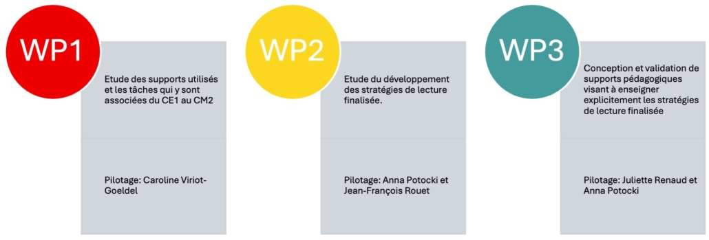 La recherche READS a obtenu le soutien de l’Agence Nationale de la Recherche. Elle traite de l’enseignement et de l’apprentissage de la lecture finalisée à l’école en France. Elle s’organise autour de trois work packages :