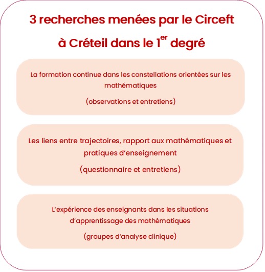 Trois actions de recherche sont menées, qui visent à enquêter sur la façon dont les enseignants s’approprient la formation continue relative aux mathématiques et à son enseignement, sur les rapports aux mathématiques des enseignants de l’académie de Créteil, sur leur expérience dans les situations d’apprentissage en mathématiques.